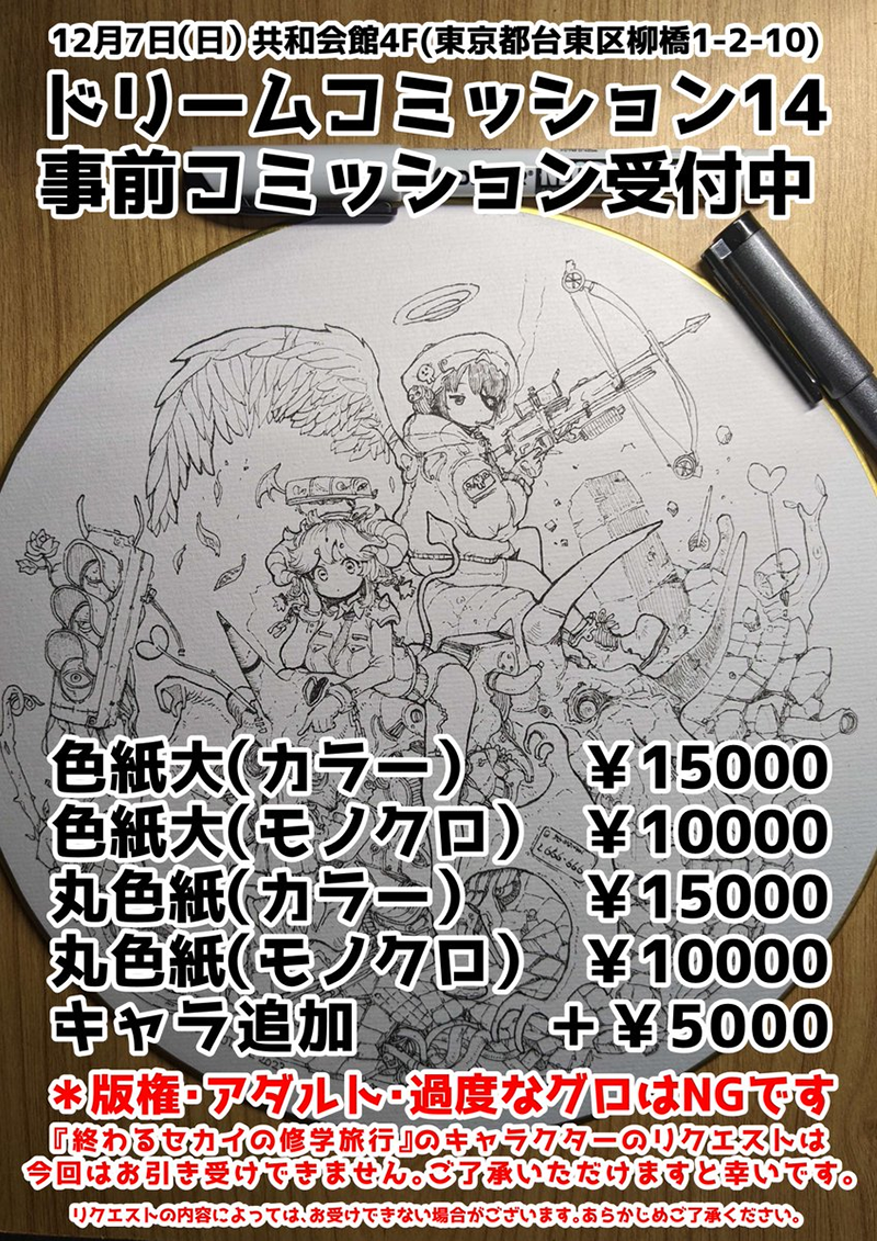 始めましての方、お久しぶりの方、ドリームコミッションはアナログイラストの魅力を堪能し発見できるイベントです。存在感、筆遣いから感じられる作家の息遣い、実物が有るという圧倒的満足感、そして作家の作画を直接見る事が出来る貴重な機会です。