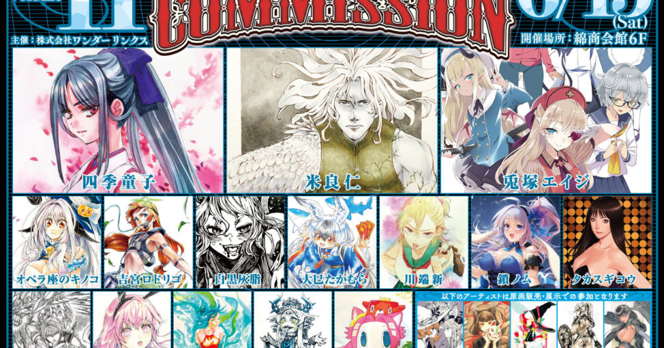 ホーム 過去のイベント ドリームコミッション11 News お知らせ ドリームコミッション11 2025.10.29 過去のイベント 開催日:2024年6月15日(土) 場所:綿商会館 参加アーティスト(敬称略・五十音順): 【会場参加】 兎塚エイジ 大巳たかむら オペラ座のキノコ 川端新 鎖ノム 四季童子 タカスギコウ 馬尾マイ hemo BOTAN mineco 三原シンジ 米良仁 白黒灰脂 吉宮ロドリゴ 【原画販売・展示】 アンドレス・ブランコ 隠れみの シキトリ 仲間安方 誉 ドリームコミッション14開催決定! ドリームコミッション12